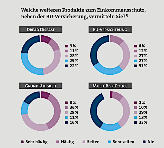 Sollte eine Berufsunfähigkeit aufgrund von Vorerkrankungen und damit zu erwartenden Ausschlüssen oder Zuschlägen für den Kunden von vornherein nicht in Betracht gezogen werden können, wird die Grundfähigkeitsversicherung von 44 Prozent der Teilnehmer als Alternative „sehr häufig“ und „häufig“ vermittelt. Jeder Fünfte bietet seinen Kunden „sehr häufig“ oder „häufig“ die Dread-Disease-Versicherung an. 12 Prozent können ihre Kunden „häufig“ von einer Erwerbsunfähigkeitsversicherung überzeugen. Die Multi-Risk-Police kommt für 10 Prozent „häufig“ zum Einsatz. Im Umkehrschluss bedeutet das, dass viele Befragte diese alternativen Lösungen „selten“ oder „sehr selten“ an den Mann oder die Frau bringen.