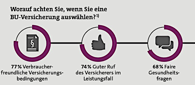 Der Einschluss einer Arbeitsunfähigkeitsklausel und damit verbunden eine Leistung aus der Versicherung bereits bei einer länger andauernden Arbeitsunfähigkeit ist 53 Prozent „sehr wichtig“ beziehungsweise „wichtig“. Gleichermaßen bedeutsam ist 74 Prozent der Versicherungsmakler, dass Teilzeitkräfte unter gleichen Voraussetzungen eine Leistung im Falle einer Berufsunfähigkeit erhalten wie Vollzeitkräfte. Knapp zwei Drittel (58 Prozent) sehen es als „sehr wichtig“ und „wichtig“ an, dass ihre Kunden eine Leistung bei einem befristeten Tätigkeitsverbot beanspruchen können.