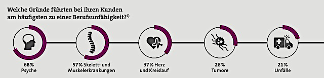 Erkrankungen der Psyche (68 Prozent) und des Muskel-Skelett-Systems (57 Prozent) führen am häufigsten dazu, dass die Versicherten nicht mehr arbeiten können. Herz- und Kreislauferkrankungen liegen mit 37 Prozent der Nennungen auf dem dritten Platz der häufigsten Ursachen für eine Berufsunfähigkeit.