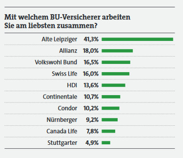 Gesagt, getan, starteten wir im Juni eine Online-Umfrage auf unserer Web-Seite pfefferminzia.de zum Thema Berufsunfähigkeitsversicherung. 525 Leser machten mit. Der Sieger ist nun gekürt: Fast jeder fünfte befragte Makler sprach sich für den Alte-Leipziger-Tarif BV 10 (SecurAL) aus.
