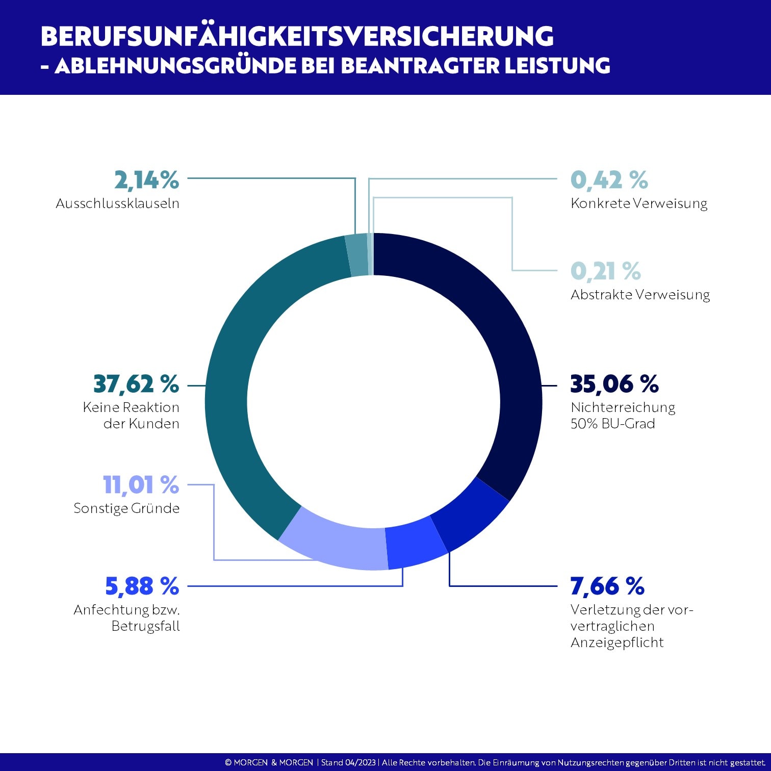 Nach wie vor führt der Abbruch in der Kommunikation durch den Versicherungsnehmer mit 37,6 Prozent die Rangliste der Gründe an, warum der Kunde keine BU-Rente erhält. Der Anteil ist aber leicht gesunken. Dicht gefolgt wird er von der Nichterreichung des 50 Prozent BU-Grades. Um knapp 2 Prozentpunkte ist der Ablehnungsgrund „Anfechtung beziehungsweise Betrugsfall“ gesunken.