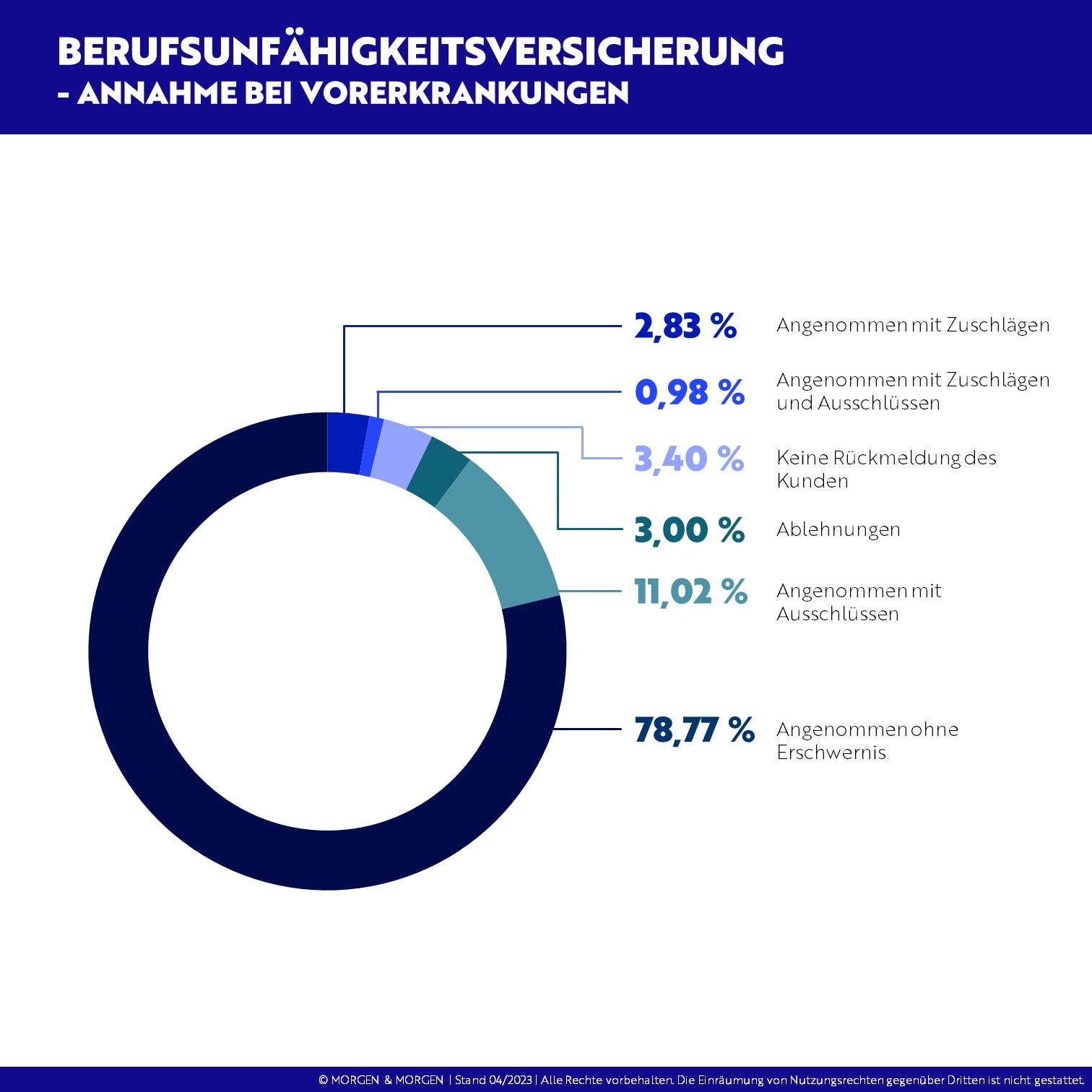 Das Rating liefert noch weitere interessante Zahlen. So ist der Anteil der Verbraucher, die trotz Vorerkrankung ohne Erschwernis eine BU-Police bekommen, von 77,2 Prozent auf 78,8 Prozent gestiegen. Diese positive Entwicklung spiegelt sich auch in der Ablehnungsquote, die um 0,58 Prozentpunkte auf drei Prozent gesunken ist, wider. Auch die Zuschläge und Ausschlüsse bei Vorerkrankungen nehmen ab. Ihr Anteil sinkt von 1,32 Prozent auf 0,98 Prozent. „Vorerkrankungen scheinen bei der Annahme in weniger ins Gewicht zu fallen“, stellt Ludwig fest.