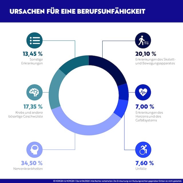 Hauptursache für eine Berufsunfähigkeit bilden laut der Analyse Nervenkrankheiten mit 34,5 Prozent. Sie haben um einen Prozentpunkt im Vergleich zur Vorjahresbetrachtung zugenommen. Erkrankungen des Skelett- und Bewegungsapparates folgen mit 20,1 Prozent vor Krebs mit 17,4 Prozent.