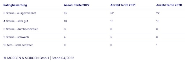 92 der diesjährig bewerteten Tarife und -kombinationen sind mit der Bestbewertung von fünf Sternen ausgezeichnet. Gefolgt von 13 Tarifen und -kombinationen, die mit vier Sternen bewertet wurden. Drei- und Zwei-Sternebewertungen erhielten die verbleibenden sieben Tarife und -kombinationen.