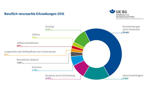 2016 trudelten bei den Berufsgenossenschaften und Unfallkassen 75.491 Anzeigen auf Verdacht einer Berufskrankheit ein. Das entspricht einem Minus von 1,9 Prozent gegenüber dem Vorjahr. Die Unfallversicherungsträger haben über das Jahr aber deutlich mehr Fälle bearbeitet, nämlich insgesamt 80.029 Stück.