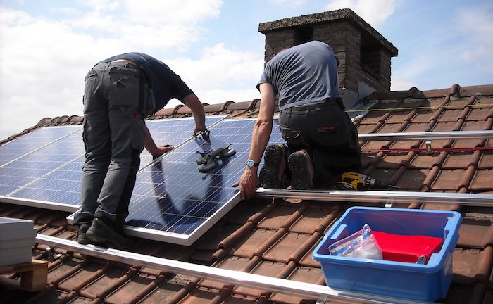 Arbeiter verlegen Solarzellen auf einem Hausdach: Wer einen gefährlichen Beruf ausübt, sollte sich besonders um die passende Absicherung kümmern.