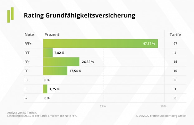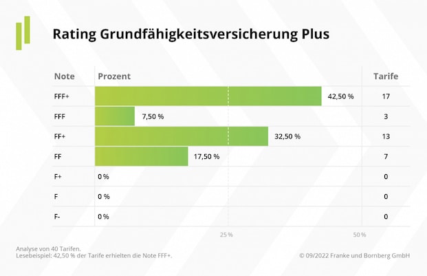 Wie es aber mit der Qualität des GF-Angebots bestellt ist, hat nun das aktuelle „Grundfähigkeitsrating 2022“ eingehend untersucht. Insgesamt wurden 97 Tarife von 26 Gesellschaften anhand von bis zu 74 Kriterien unter die Lupe genommen (Stand September 2022). Franke und Bornberg unterscheidet dabei zwischen „Grundfähigkeit“ und „Grundfähigkeit Plus“. Bedeutet: Tarife der Plus-Variante bieten Zusatzbausteine mit weiteren Leistungsauslösern, zum Beispiel einen Versicherungsschutz bei schweren Krankheiten.
