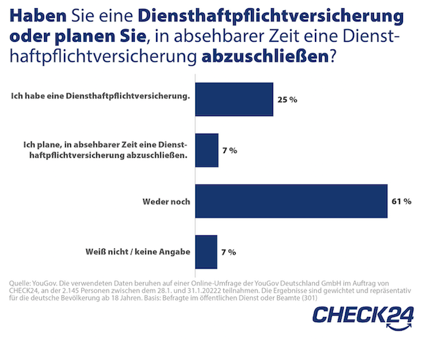 Immerhin 7 Prozent der Befragten gaben an, in absehbarer Zeit eine Diensthaftpflichtpolice abschließen zu wollen; weitere 7 Prozent machten keine Angabe. „Das Ergebnis überrascht“, kommentiert Lorenz Becker, Haftpflichtexperte bei Check24, die Umfrage. „Denn während der Dienstzeit kommt die Privathaftpflichtversicherung nicht für Schäden auf. Angestellte im öffentlichen Dienst oder Beamte müssen bei grober Fahrlässigkeit mit Regressforderungen ihres Arbeitgebers oder Dienstherrn rechnen.“