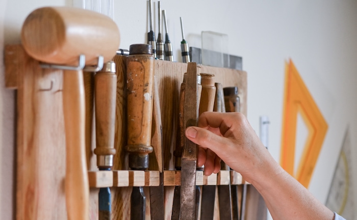 Da ist Fingerfertigkeit gefragt: In einer Papierwerkstatt hängen Werkzeuge, die für die Reparatur von Büchern und anderen Schriften benutzt werden.