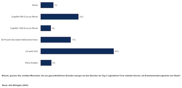 Auf die Frage, was Berufsanfänger, Studenten oder Azubis im Fall der Fälle erhalten, gaben ein gutes Drittel (30 Prozent) der Befragten an, überhaupt nicht zu wissen, ob und wenn, in welcher Höhe Leistungsansprüche bestünden. 26 Prozent wählten treffend das „Bürgergeld“ (früher Hartz IV), 10 Prozent zeigten sich mit der Antwortoption „nichts“ noch pessimistischer. 7 Prozent sind der Auffassung, dass sie 60 Prozent des Nettoeinkommens bekämen, das der Ausbildung entsprechend erzielt worden wäre. Immerhin 4 Prozent hoffen auf die Höhe einer „Eckrente“. Damit wird eine Standardrente bezeichnet, die ein Rentenversicherter erhält, wenn er 45 Jahre lang Beiträge für ein Durchschnittsentgelt geleistet hätte.