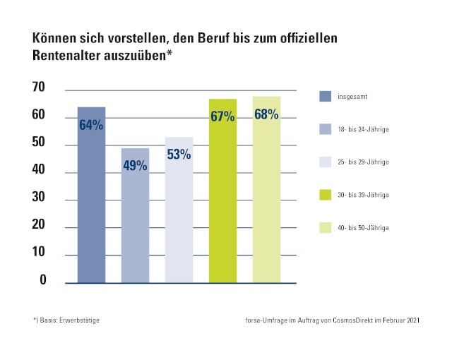 Fast zwei von drei Erwerbstätige (64 Prozent) in Deutschland können sich vorstellen, bis zu ihrer Rente in ihrem aktuellen Beruf zu arbeiten. Zu diesem Ergebnis kommt eine repräsentative Umfrage des Marktforschungsunternehmens Forsa im Auftrag von Cosmos Direkt. Ein weiteres Ergebnis der im Februar durchgeführten Befragung sei, dass eher ältere Erwerbstätige sich das vorstellen können.