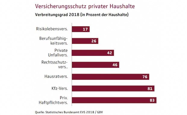 Die private Haftpflichtversicherung ist in 83 Prozent der deutschen Haushalte anzutreffen, ähnlich hoch ist die Verbreitung der Kraftfahrtversicherung mit 81 Prozent, gefolgt von der Hausratversicherung mit einem Anteil von 76 Prozent. Damit zeigt sich, dass die Deutschen ihren Hausrat gut dreimal häufiger abgesichert haben als ihre Arbeitskraft – so erreicht die Berufsunfähigkeitsversicherung lediglich einen Verbreitungsrad von 26 Prozent.