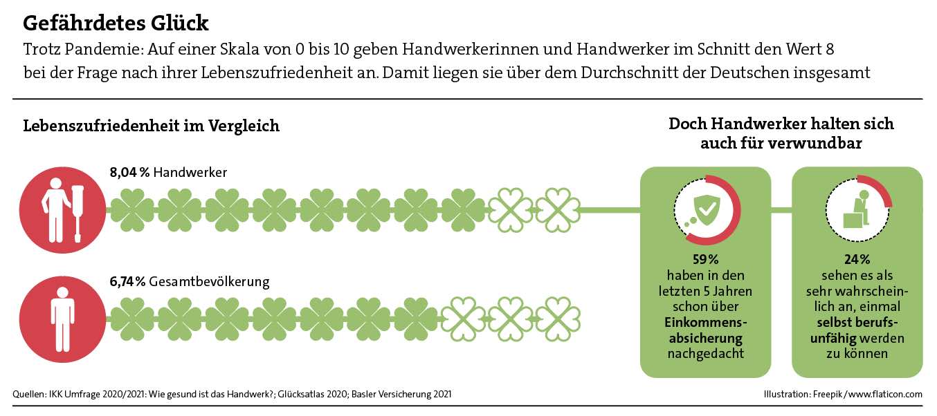 Handwerk hat goldenen Boden, sagt der Volksmund – und tatsächlich empfinden Menschen, die in handwerklichen Berufen arbeiten, eine höhere Lebenszufriedenheit als die Durchschnittsbevölkerung (siehe Grafik). Glücklich zu sein mit dem, was man tut, fördert das seelische Wohlbefinden – es schützt aber nicht vor den Risiken, die mit der Ausübung der Tätigkeit einhergehen.