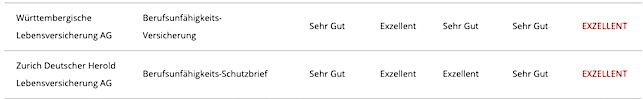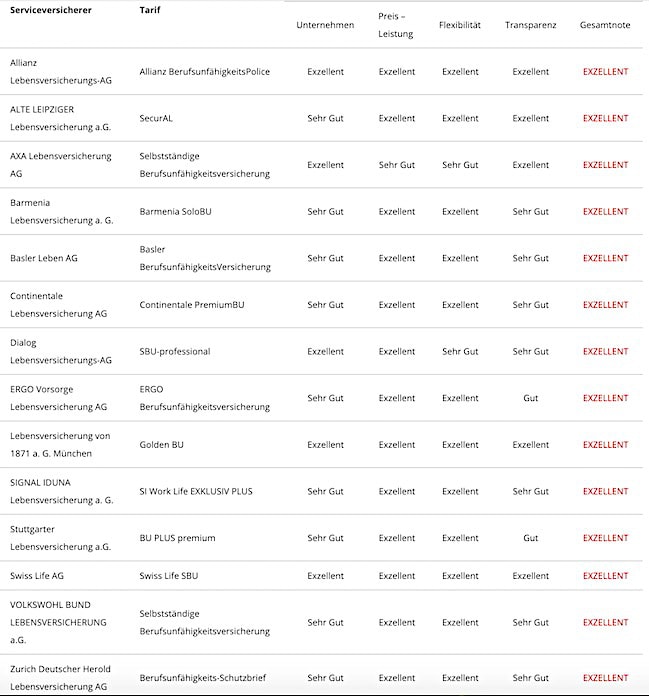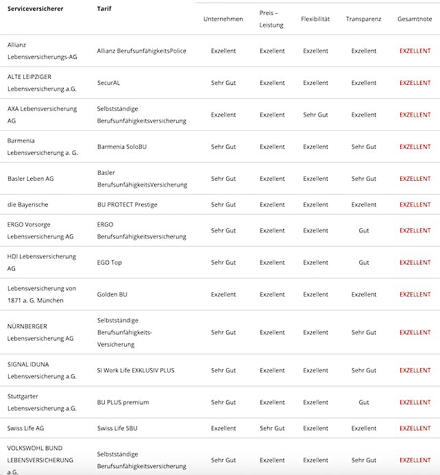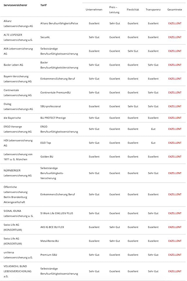 Welche Versicherer die Analysten in den verschiedenen Berufsgruppen überzeugen konnten und die Bestnote „Exzellent“ erhielten, erfahren Sie auf dieser und den folgenden Seiten.