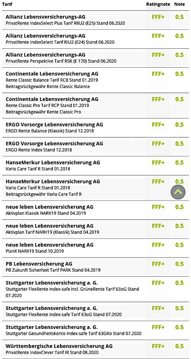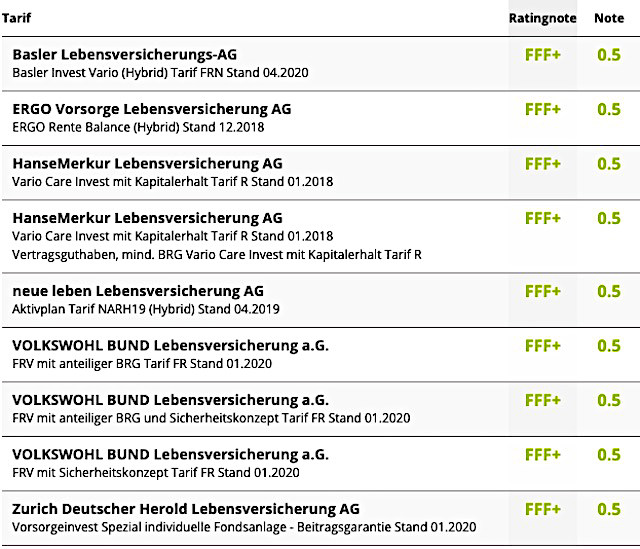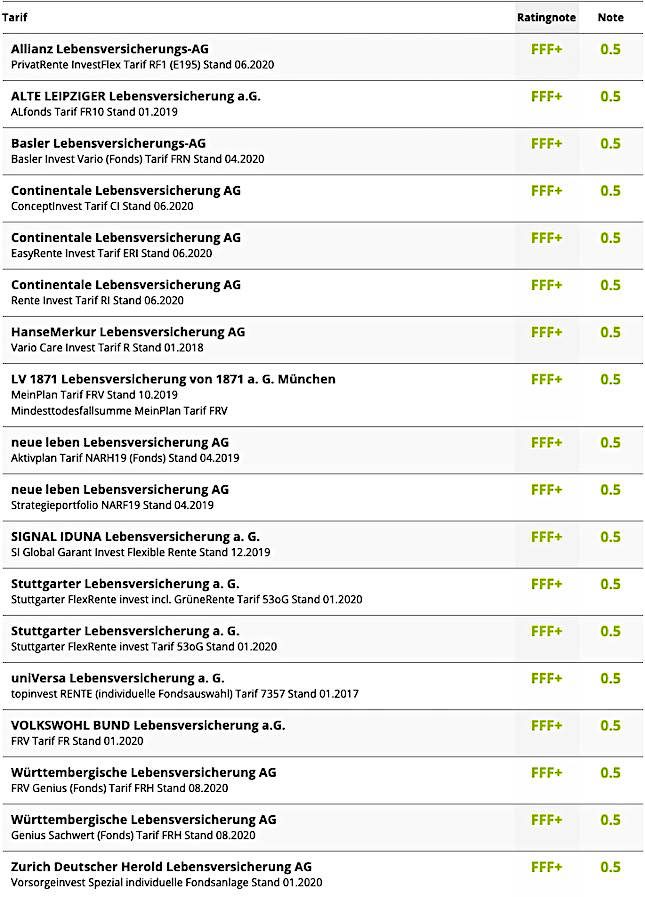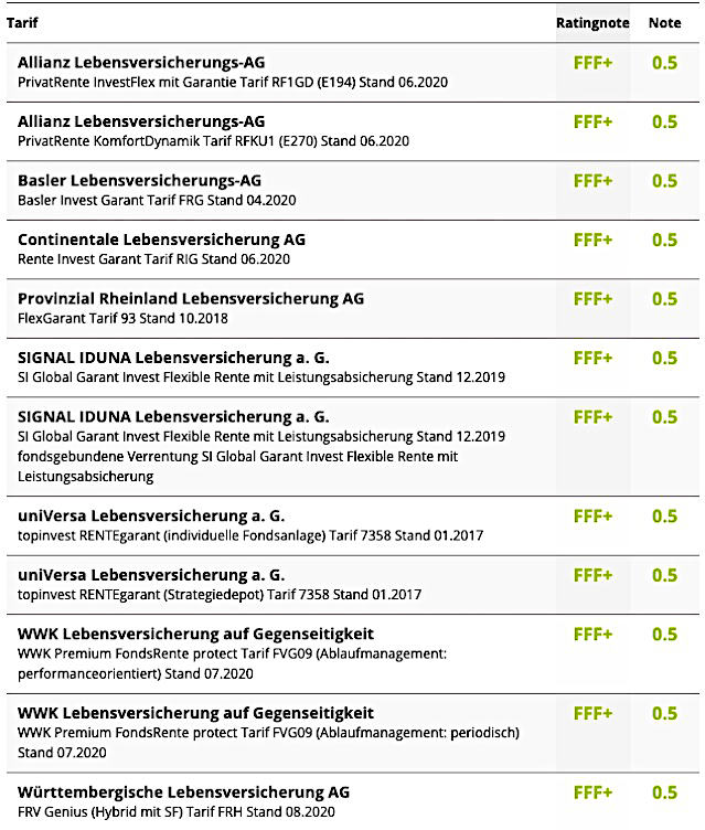 Das aktuelle Rating bewertet jeweils das aktuelle Tarifspektrum in den Bereichen Flexibilität, Transparenz und Produktkonzept. Die Performance, also die Höhe garantierter oder prognostizierter Rentenwerte, ist nicht Bestandteil der Analyse. Mit Stand August 2020 erreichen 19,4 Prozent aller Tarife die höchste Bewertungsstufe FFF+ (hervorragend). Überproportional viele leistungsstarke Produkte mit den Rating-Ergebnissen FFF+ und FFF, finden sich unter den Konzepten „Beitragsorientierter Hybrid“, „Garantieorientierter Hybrid“ sowie „Fonds“.