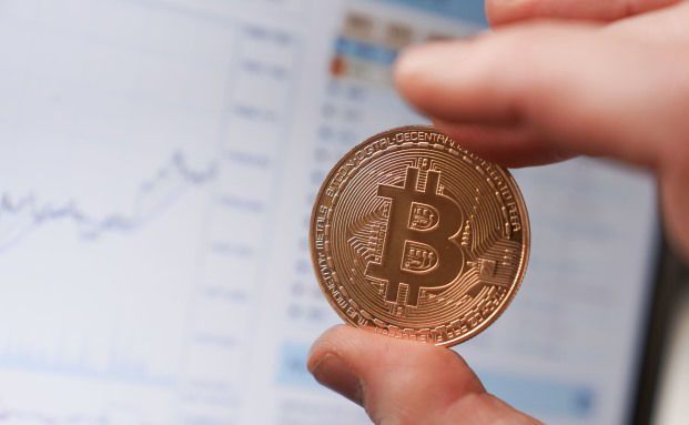 Ein Mann hält einen Bitcoin: Die Münzen sind dabei nur Souvenirs. Denn Bitcoin ist eine rein virtuelle Währung.