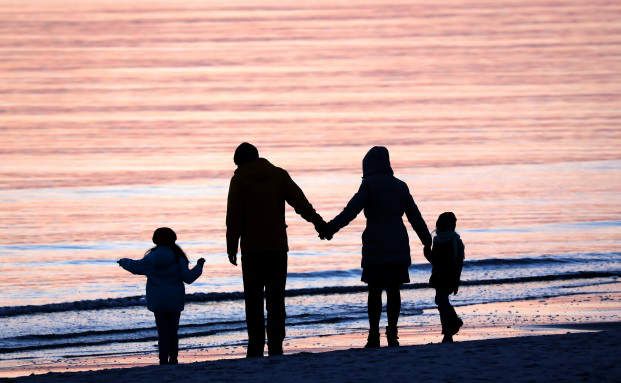 Eine Familie ist im Licht der untergehenden Sonne an der Ostsee auf der Insel Hiddensee unterwegs.