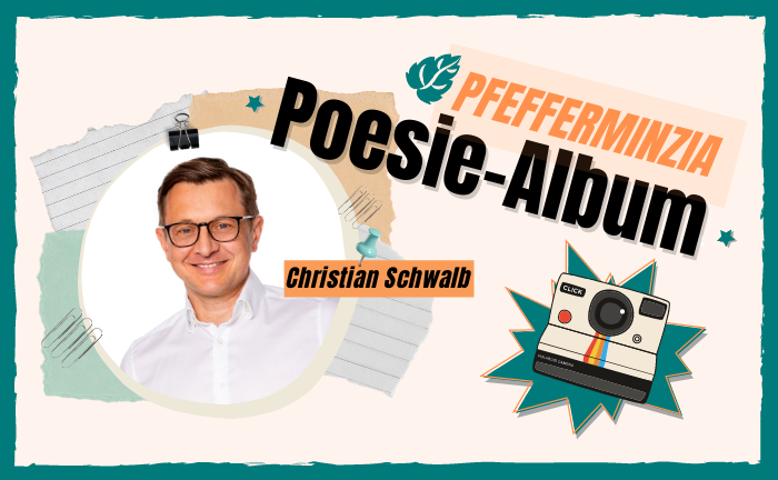 In dieser Woche trägt sich Christian Schwalb in das Pfefferminzia-Poesie-Album ein. Er ist Geschäftsführer des Beratungsunternehmens BSC GmbH, Geschäftsführer von Worksurance, geschäftsführender Gesellschafter des Biometrie Expertenservice und Gründer der Scala Holding.