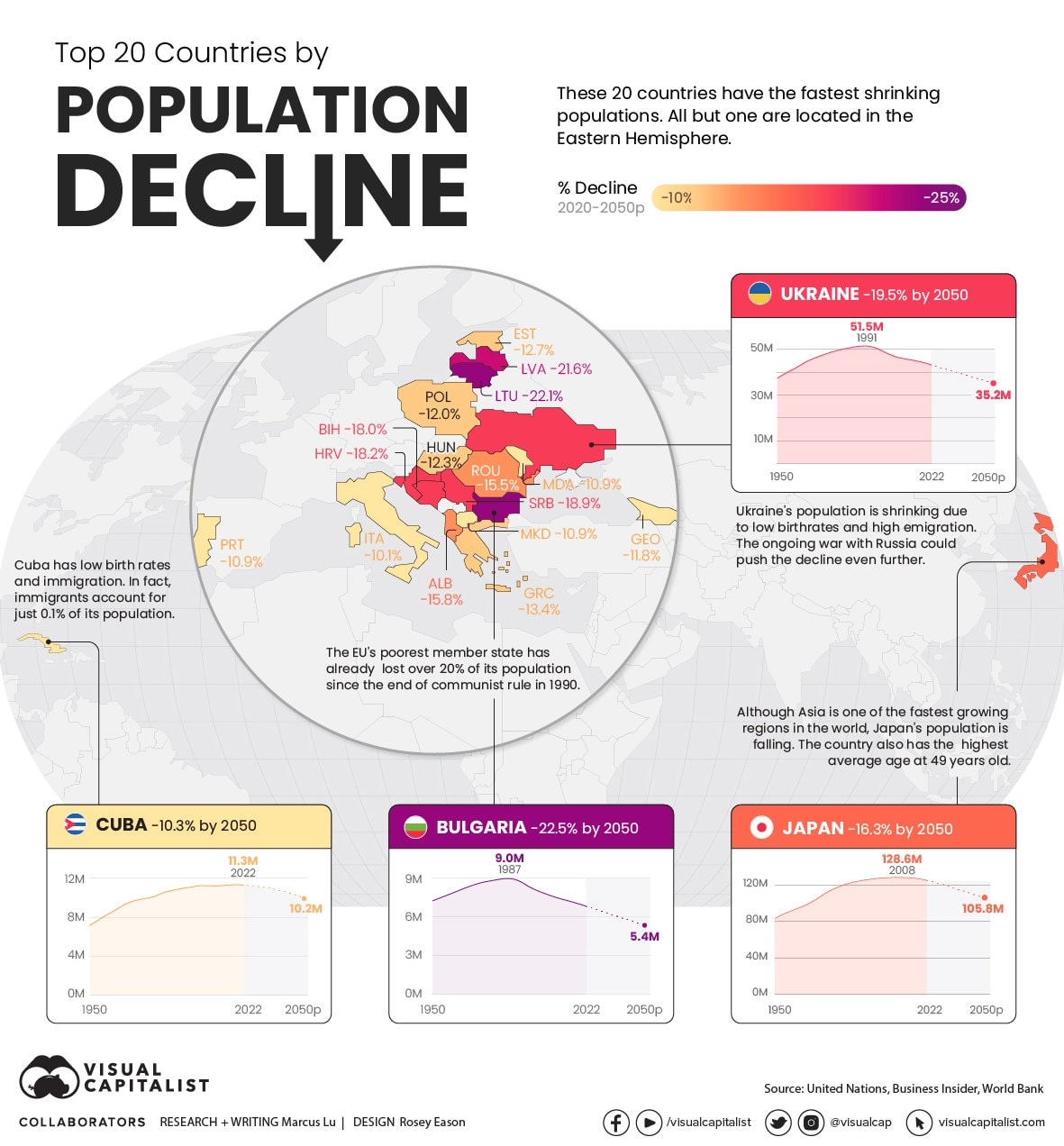 Doch das ist immer noch weniger als das, was in Osteuropa derzeit vor sich geht. Denn jene Länder mit den schnellsten Bevölkerungsrückgängen sind eben dort zu finden. Auf Rang 1 liegt Bulgarien mit minus 22,5 Prozent von 2020 bis 50. Es folgen Litauen (minus 22,1 Prozent) und Lettland (minus 21,6 Prozent). Die Grafiker von Visualcapitalist haben das alles mal in eine – wie gewohnt sehr schicke – Infografik gepackt. Hier ist sie: