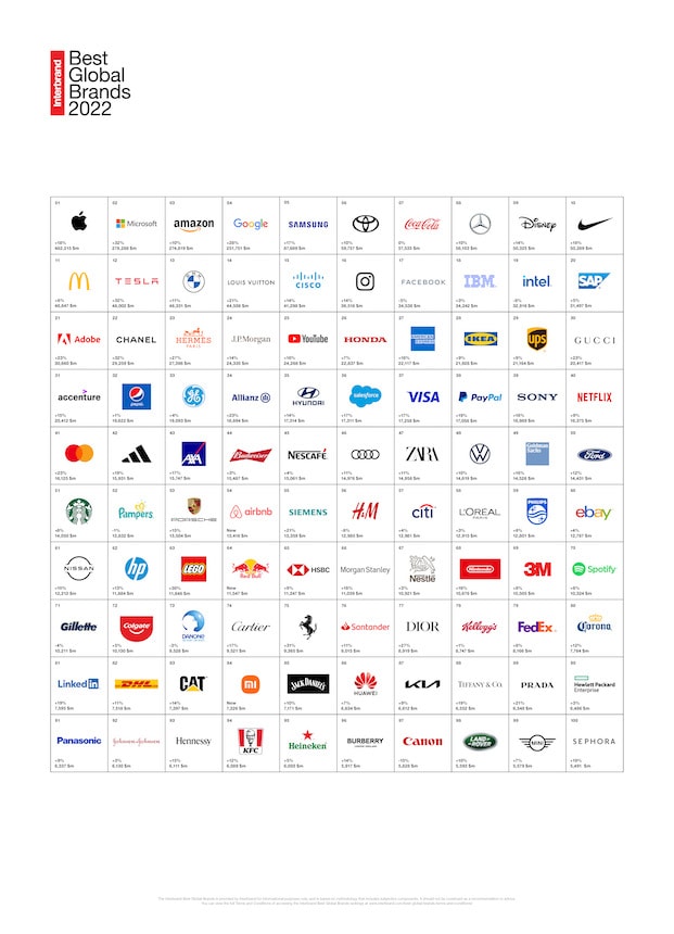 Die Allianz bleibt die wertvollste globale Versicherungsmarke. Die Münchner verteidigten im „Best Global Brands 2022“-Ranking den 34. Platz. Ihr Markenwert stieg um 23 Prozent auf 18,7 Milliarden Euro. Axa folgt als einzige weitere Versicherungsmarke in der Top 100 auf Rang 43 – fünf Positionen höher als 2021. Apple bleibt im zehnten Jahr in Folge an der Spitze, Microsoft verdrängt Amazon vom zweiten Platz und Tesla überholt BMW.