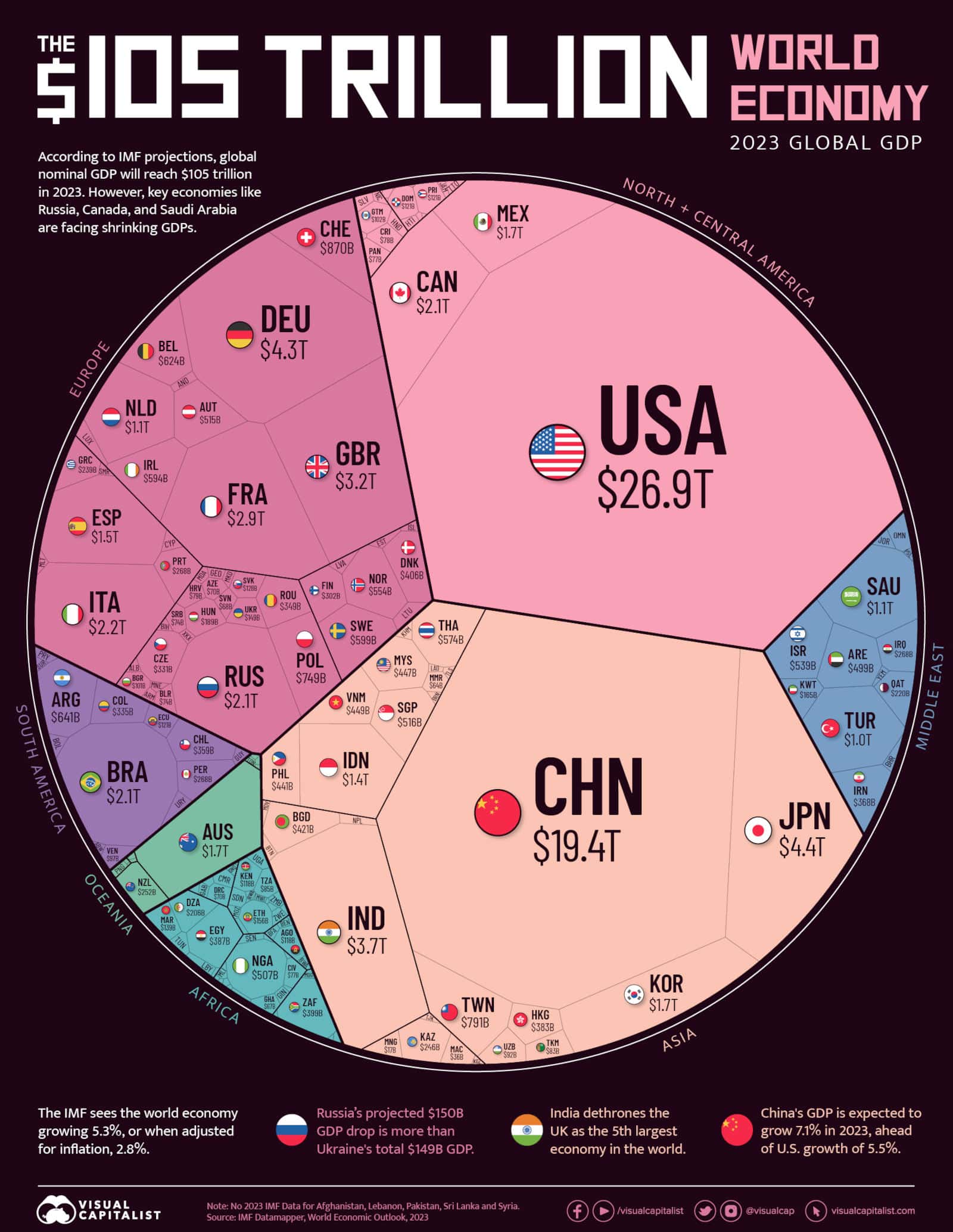 Doch wie teilt sich diese Summe auf? Das haben jetzt die Leute von Visual Capitalist in eine Grafik gepackt. Das Feld dominieren die beiden Supermächte USA und China. Aber die Deutschen mischen auf Rang 4 munter mit. Immerhin besorgen sie mit nur einem Prozent der Weltbevölkerung über 4 Prozent der Wirtschaftsleistung. Und wer ist nur knapp davor? Sehen Sie selbst: