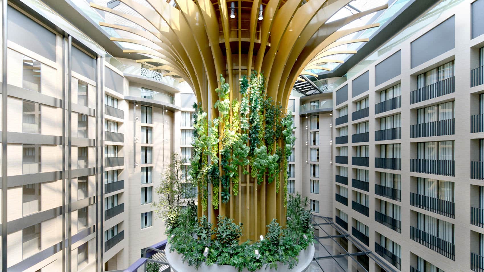 Knapp 2.000 Exemplare von 22 unterschiedlichen Pflanzarten will man an 36 baumartigen Vertikal-Lamellen wachsen lassen. Je nach Tageszeit will man sie unterschiedlich beleuchten. Das Gesamtwerk nennt sich „Living Tree“ und hat einen Stamm mit 6,5 Metern Durchmesser und eine Baumkrone, die bis unter das durchsichtige Dach des Atriums reicht, in 24 Metern Höhe mit 20 Metern Durchmesser.