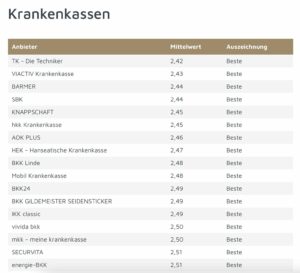 Die bestbewerteten Anbieter der gesamten Studie kommen dabei aus der Kategorie „Krankenkassen“. Gesamtsieger ist die Techniker Krankenkasse mit einem Mittelwert von 2,42, gefolgt von Viactiv (2,43), Barmer und SBK (jeweils 2,44).
