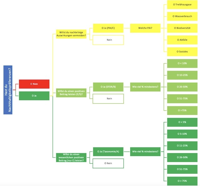 - Der Kunde kann schädliche Auswirkungen vermeiden wollen. Das sind die sogenannten PAI (Principal Adverse Impacts oder Wesentliche nachteilige Auswirkungen) oder C-Produkte.