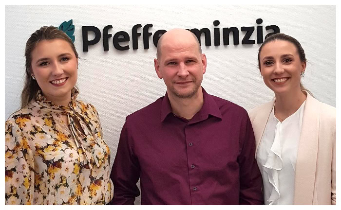 Alexandra Pfeiffer-Hillmann (li.) und Lena König von der IKK Classic mit Pfefferminzia-Redakteur Andreas Harms.