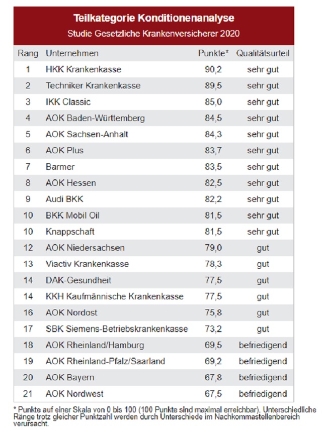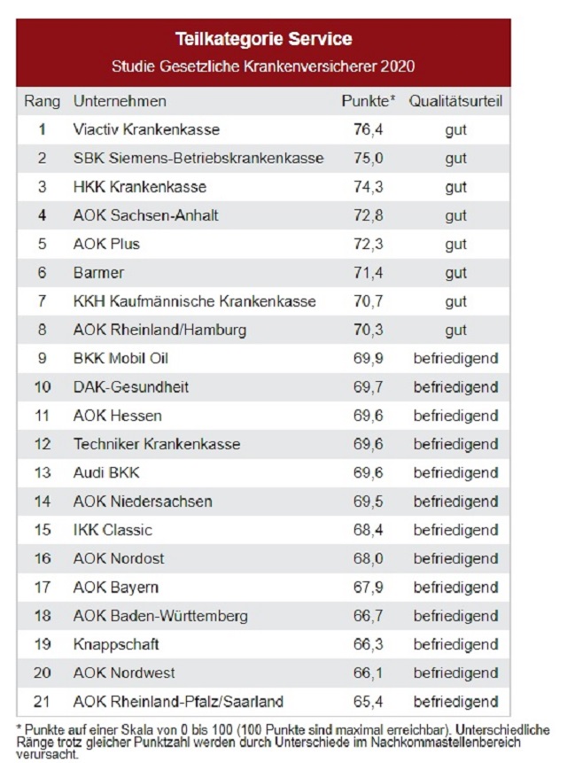 Um die Servicequalität zu untersuchen, führte das DISQ bei jedem Unternehmen je zehn verdeckte Telefon- und E-Mail-Tests durch sowie je zehn Prüfungen der Internetauftritte durch geschulte Testnutzer und eine detaillierte Inhaltsanalyse der Websites. Insgesamt flossen 651 Servicekontakte mit den Versicherern in die Auswertung ein. In Kooperation mit Krankenkassennetz.de wurden zudem die Konditionen und Leistungen – wie Zusatzbeiträge, Bonusmodelle, Mehrleistungen, Vorsorgeprogramme und Wahltarife – ermittelt und bewertet (Datenstand: März 2020).