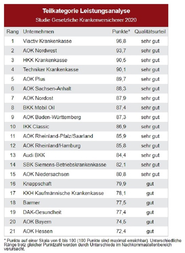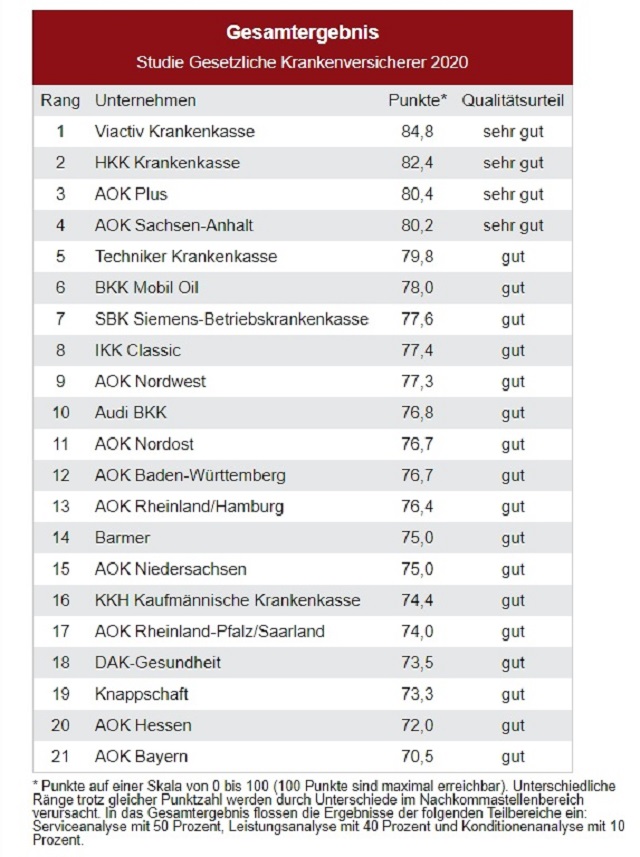 Testsieger der DISQ-Untersuchung ist die Viactiv Krankenkasse mit dem Qualitätsurteil „sehr gut“. Insbesondere der Service und die Leistungen können überzeugen, heißt es. So werden Fragen laut Test per Telefon- und E-Mail schnell, verständlich und kompetent beantwortet. Zudem sei das Leistungspaket, etwa bei Gesundheitsreisen sowie Zahn- und Krebsvorsorge, sehr umfangreich.