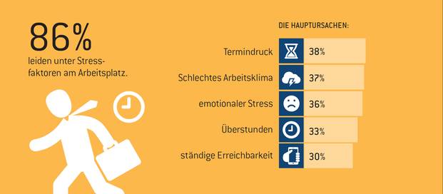Deutschlands Arbeitnehmer brennen aus: 86 Prozent der Bundesbürger leiden unter Stressfaktoren am Arbeitsplatz. Besonders zu schaffen machen den Befragten ständiger Termindruck (38 Prozent), ein schlechtes Arbeitsklima (37 Prozent) und emotionaler Stress (36 Prozent).