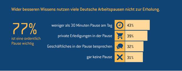 Auch die Art der Pausengestaltung und die Bedeutung, die man ihr zumisst, sind wichtig. Wie die Studie zeigt, nutzt ein Drittel der Arbeitnehmer Pausen, um parallel Dienstliches zu besprechen (32 Prozent). Noch mehr verbringen sie mit privaten Erledigungen wie Einkaufen, Kleidung zur Reinigung bringen oder Termine organisieren (39 Prozent).