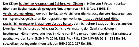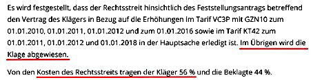 Was hat der Kläger gewonnen? Vermutlich weniger als er nach den ganzen Anwaltskosten, Gerichtskosten sowie vorgerichtlichen Kosten – die ihm nicht zugebilligt wurden – gezahlt hat. Der Kläger wollte seine Beiträge ab 2010 (vermutlich Eintritt in den Tarif) samt Zinsen erstattet haben. Das Gericht erteile ihm mehrere Schlappen.