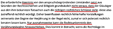 Dass der Versicherungsnehmer die richtigen Schlüsse zieht, muss nicht durch die Versicherung sichergestellt werden, da sie fehlerbehaftete Vorstellungen nie ausschließen kann. Daher kann nur ausnahmsweise eine Hemmung der Verjährung aufgrund von Rechtsunkenntnis gelten. Notfalls müsse man auf die Hilfe fachkundiger Dritter zugreifen. Erst wenn diese „keinen Durchblick“ hätten, wäre die Hemmung denkbar.
