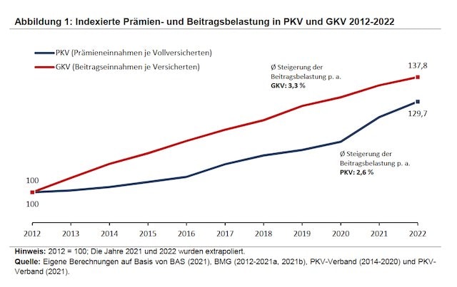 Von 2012 bis 2022 ergebe sich in der PKV ein Wachstum der Prämieneinnahmen je Vollversicherten um 29,7 Prozent und in der GKV um 37,8 Prozent, schreibt das WIP weiter. „Damit nahm die Belastung der PKV-Versicherten im betrachteten Zeitraum in geringerem Maße zu als in der GKV. Über den gesamten Zeitraum betrachtet ergibt sich eine durchschnittliche jährliche Steigerung der Prämien- beziehungsweise Beitragsbelastung von 2,6 Prozent in der PKV und 3,3 Prozent in der GKV“, heißt es im Papier weiter.