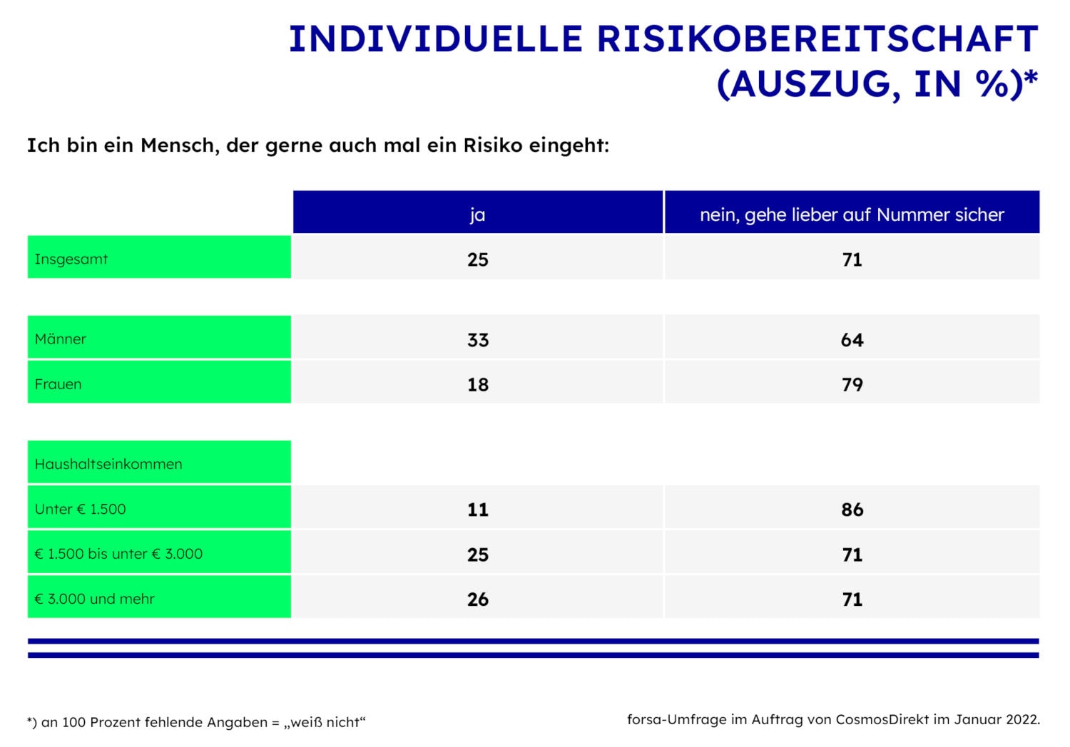Ein anderer Aspekt spiegelt perfekt das Klischee des sicherheitsbetonten Deutschen wider. Denn eine deutliche Mehrheit von 71 Prozent sagt von sich, lieber auf Nummer sicher zu gehen. Wobei sich einige Unterschiede bezüglich Geschlecht und Einkommen entdecken lassen, wie die folgende Tabelle zeigt.