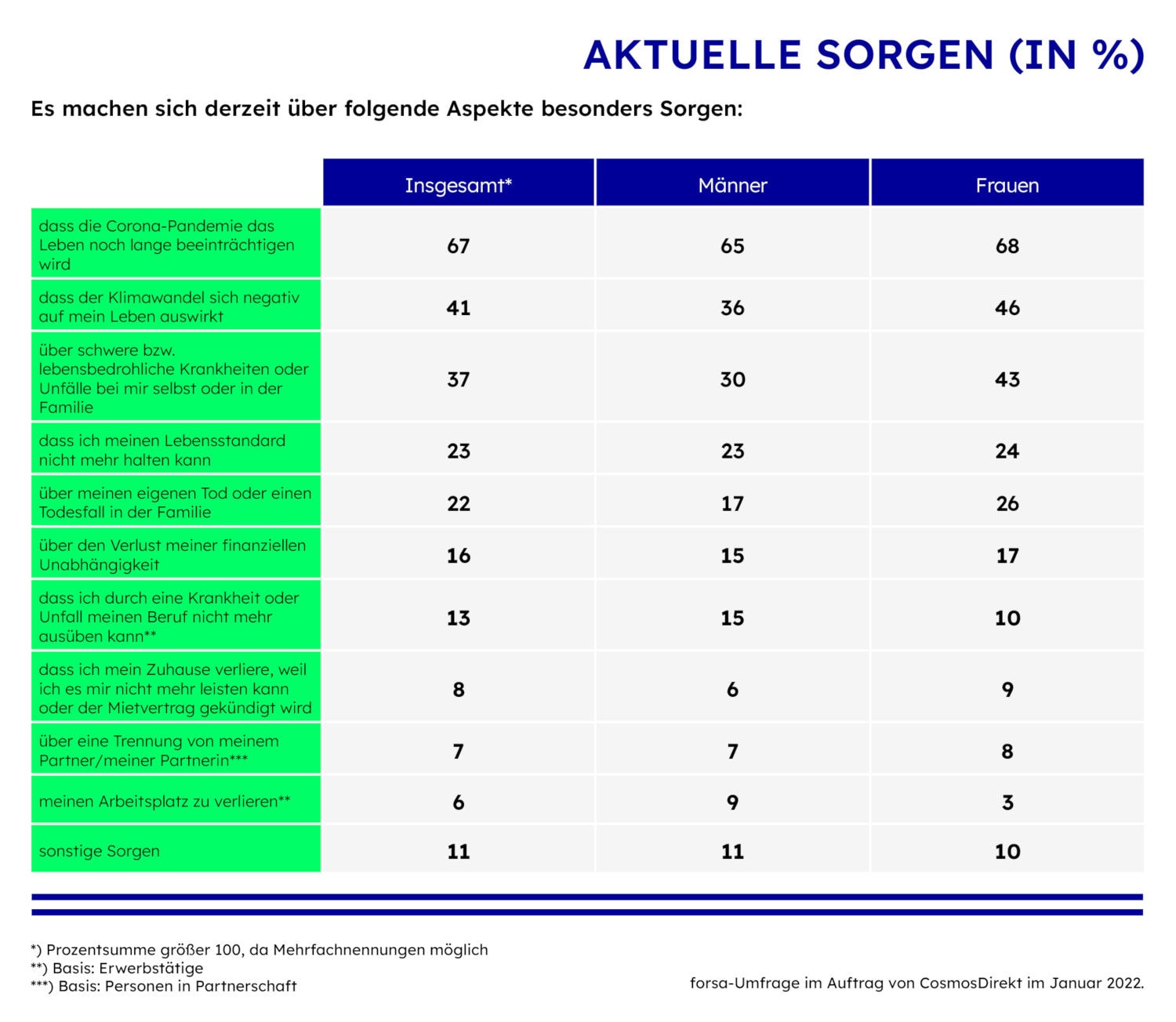 Weniger stark fiel dabei die Sorge ins Gewicht, das bei sich oder in der Familie schwere Krankheiten oder Unfälle auftreten könnten (37 Prozent). Wobei mehr Frauen als Männer das angaben (43 gegenüber 30 Prozent). Bedenken bezüglich des eigenen Lebensstandards hegten hingegen lediglich 23 Prozent der Befragten. Weitere Zahlen zeigt die Tabelle.