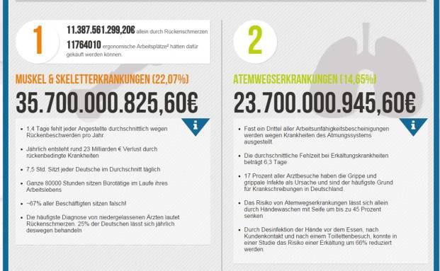 Mehr als 161 Milliarden Euro – so viel Geld entgeht Deutschland jedes Jahr durch Krankheiten. Allein Muskel- und Skeletterkrankungen tragen mit 35 Milliarden Euro Kosten zur Misere bei. Weitere Details zeigt die interaktive Infografik der Woche.