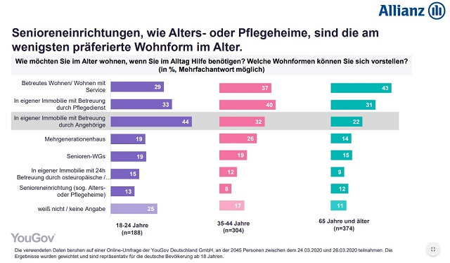 92 Prozent der Immobilienbesitzer, die in der eigenen Immobilie leben, wollen laut der Studie dort auch im Alter bleiben. Die meisten möchten entweder von einem Pflegedienst oder von ihren Angehörigen gepflegt werden. Letzteres ist vor allem für jüngere Befragte eine Option. Von den über 65-Jährigen wollen nur 22 Prozent, dass ihre Angehörige, etwa die eigenen Kinder, die Pflege übernehmen. Wer zur Miete wohnt, kann sich im Alter am ehesten eine Form des betreuten Wohnens vorstellen.