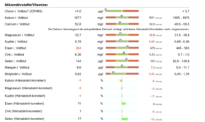 Bei einem orthomolekularen Blutbild wird genauer hingeschaut. Dieses kann beispielsweise zusätzlich ein Vitaminogramm, Mineralogramm und ein Aminogramm enthalten. Es werden also verschiedene Vitamine, Mineralien und Aminosäuren einzeln aufgeschlüsselt und dargestellt (siehe Grafik 2 und 3). Dabei werden die relevanten Werte im Vollblut, also in den Zellen gemessen (siehe Grafik 4) und die gemessenen Werte ins Verhältnis zur Zahl der roten Blutkörperchen gesetzt (Hämatokrit-korrelierte Darstellung).