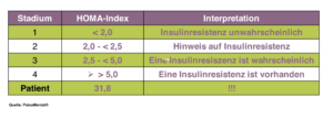 Dessen primäre Aufgabe ist es, dafür zu sorgen, dass Zucker (Glukose) aus der Nahrung in die Zellen zur dortigen Verbrennung in den Mitochondrien gelangen kann. Reagieren die Zellen immer schlechter auf das Hormon, wird in diesem Zusammenhang von einer Insulinresistenz gesprochen – und das ist ein Vorbote für Diabetes Typ II. Liegt der Homa-Index unter 2, ist eine Insulinresistenz unwahrscheinlich. Bei Werten zwischen 2,5 bis 5 ist sie wahrscheinlich und bei einem Homa-Index > 5 gilt sie als vorhanden (siehe Grafik 5).