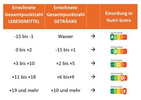 Im nächsten Schritt werden die positiven Punkte ermittelt. Hier sind maximal 15 Punkte zu erreichen. Pluspunkte gibt es für den Eiweiß- und Ballaststoffgehalt und den Gewichtsanteil von Obst, Gemüse oder Nüssen. Nun werden die negativen mit den positiven Punkten verrechnet. So erhält man das Endergebnis. Aus diesem wird der Nutri-Score abgeleitet. Die Angaben beziehen sich immer auf 100 Gramm oder 100 Milliliter eines Produkts. Für unverarbeitete Lebensmittel wie Obst und Gemüse ist der Score damit nicht geeignet und kommt nicht zum Einsatz.