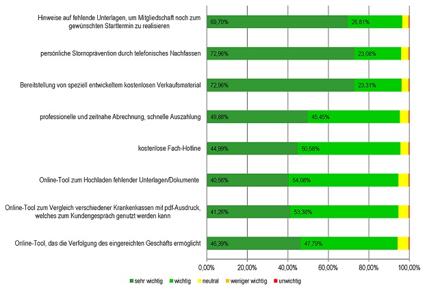 Die Ergebnisse zeigen, welche Unterstützung sich Makler von den Krankenkassen wünschen und auf welche Faktoren sie Wert legen. So geben etwas mehr als zwei Drittel der Befragten an, eine starke Finanzkraft und stabile Beiträge seien für sie sehr wichtig. Gegenüber der Vorjahresbefragung ist das eine Steigerung um knapp 12 Prozentpunkte.