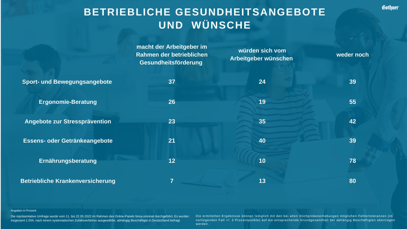 Doch schon bei der nächsten Frage sinken die Werte wieder kräftig, denn nun geht es darum, was Arbeitgeber für die Gesundheit ihrer Leute tun. Immerhin bieten 37 Prozent Möglichkeiten für Sport und Bewegung. 26 Prozent lassen ihre Angestellten ergonomisch beraten, und 23 Prozent helfen dabei, Stress überschaubar zu halten. Geht es danach, was sich Angestellte zusätzlich wünschen, würden Arbeitgeber mehr Stressvorsorge anbieten, ebenso wie Essen und Trinken, zum Beispiel in Kantinen.
