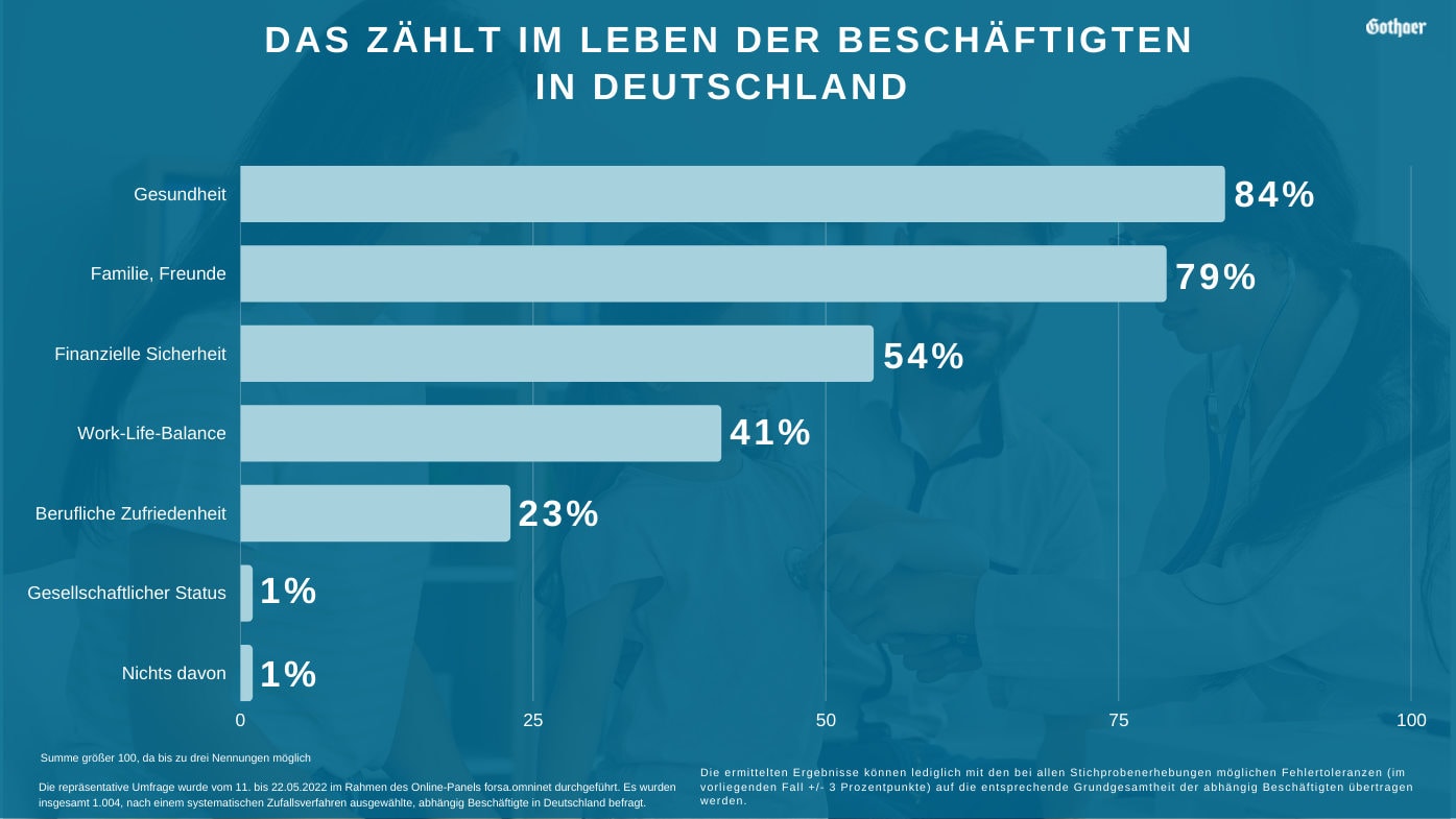 Das Wichtigste im Leben der deutschen Beschäftigten ist Gesundheit. Dann kommen Familie und Freunde, und erst an dritter Stelle folgt finanzielle Sicherheit, also: Geld. Das ergibt eine Umfrage des Meinungsinstituts Forsa im Auftrag der Gothaer Finanzholding, bei der 1.004 Arbeitnehmerinnen und Arbeitnehmer ab 18 Jahren zu Wort kamen.