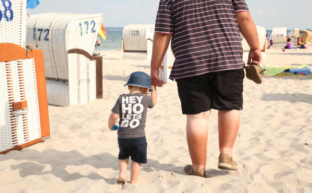 Ein übergewichtiger Mann geht am Strand der Ostsee in Timmendorfer Strand mit seinem kleinen Kind an der Hand. In Deutschland, wie auch in ganz Europa, nimmt die Zahl der Übergewichtigen beständig zu.