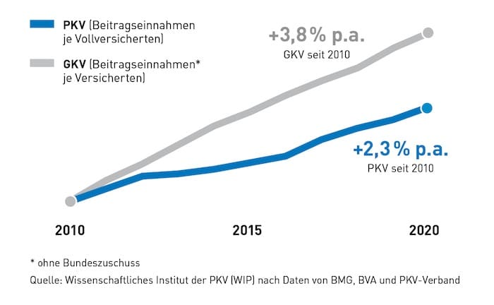 Und das sind die Zahlen: Von 2010 bis 2020 ergebe sich in der PKV ein Anstieg der Beitragseinnahmen um 25,3 Prozent und in der GKV um 45,6 Prozent je Versicherten. Über den gesamten 10-Jahres-Zeitraum betrage die durchschnittliche jährliche Steigerung 2,3 Prozent in der PKV und 3,8 Prozent in der GKV.