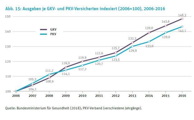 Die Ausgaben je PKV-Versicherten stiegen laut WIP-Studie in den letzten zehn Jahren um 43,1 Prozent an, wohingegen die GKV im selben Zeitraum mit einem Anstieg von 48,3 Prozent ein deutlich höheres Ausgabenwachstum je Versicherten aufwies.