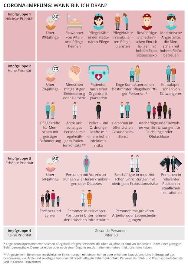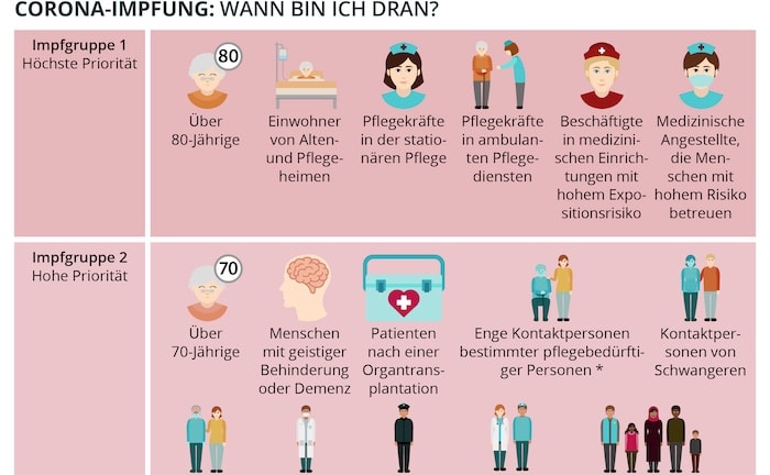 Ein Prozent der deutschen Bevölkerung ist bis Donnerstagmittag einmal gegen das Coronavirus geimpft worden, wie das Robert Koch-Institut (RKI) mitteilte. Demnach erhielten bislang 842.455 Menschen den Impfstoff. Welche Reihenfolge bei den Impfungen vorgesehen ist, zeigt die Infografik.